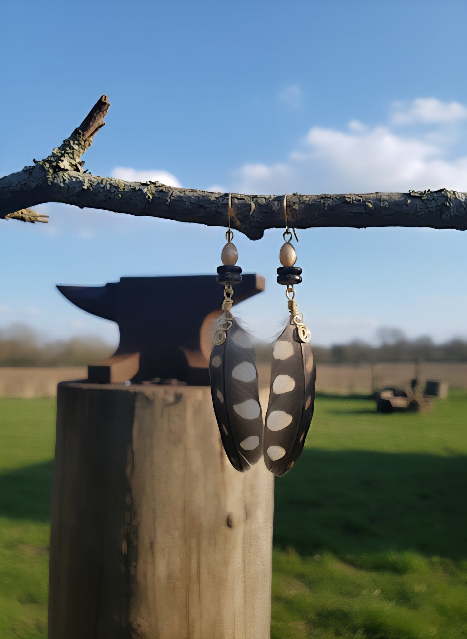 Aretes de plumas de falcón, combinada con semilla de camandula y coco.