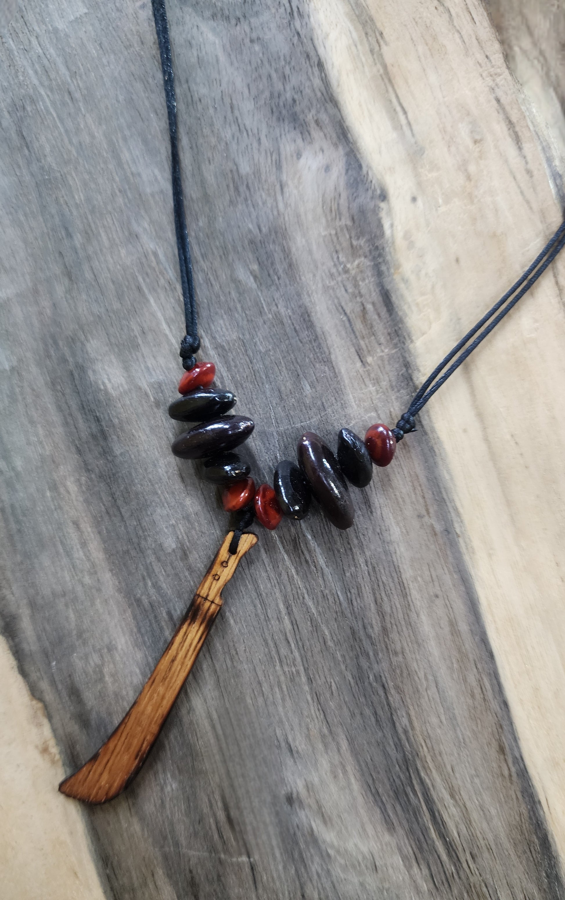 Machete en madera de pino y semillas de granate (rojo) y oreja de mono (marrón)