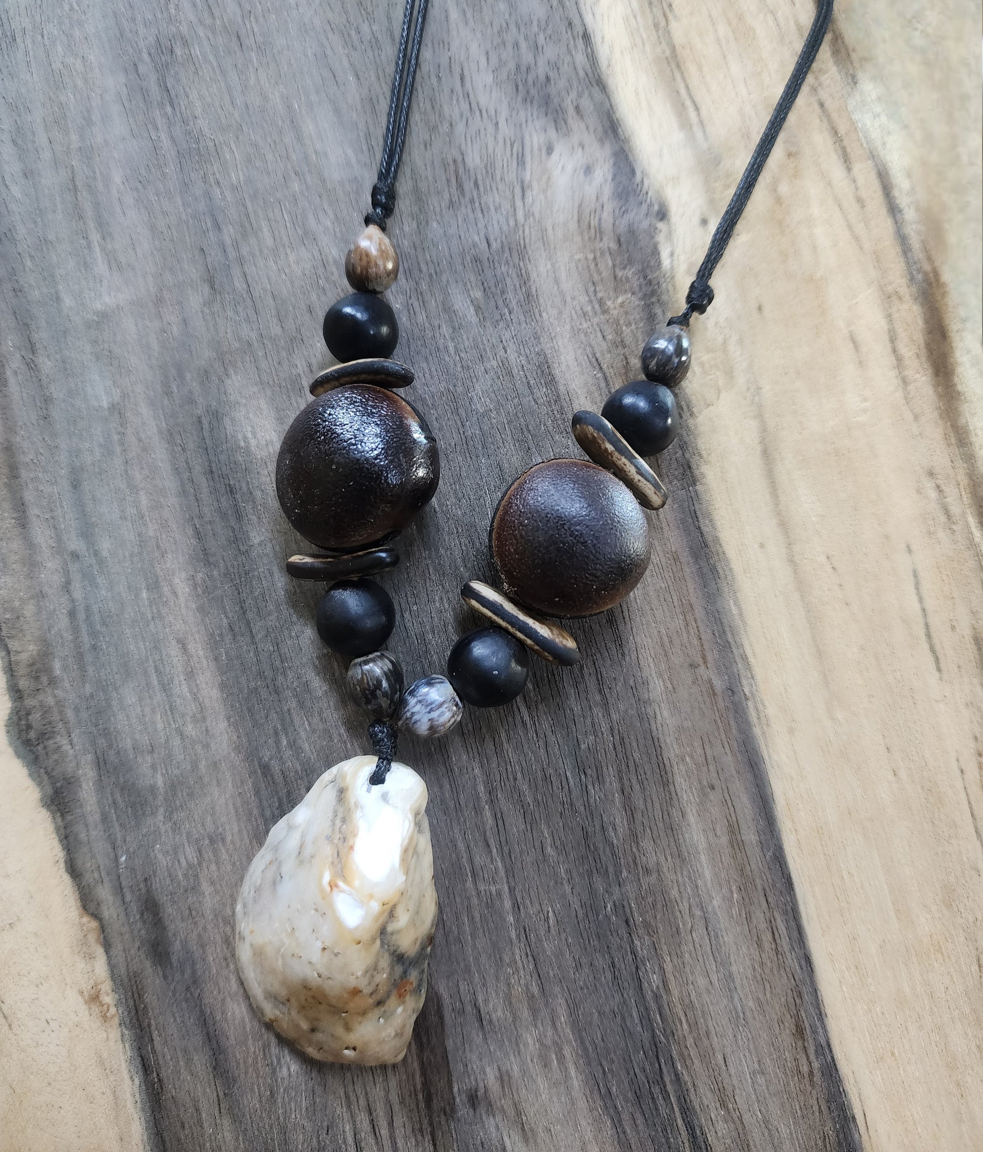 Collar con semilla de ojo de buey, flamboyan, jaboncillo y camandulas